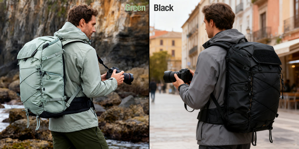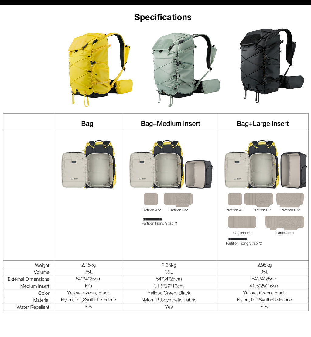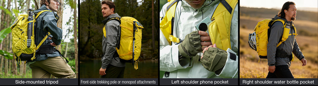 With a 35L capacity, the backpack accommodates cameras, lenses, drones, a 15.6” laptop, iPad, tripod, trekking poles, and more. Dual compartments separate personal items from camera gear, with quick-access side and top openings for convenience.