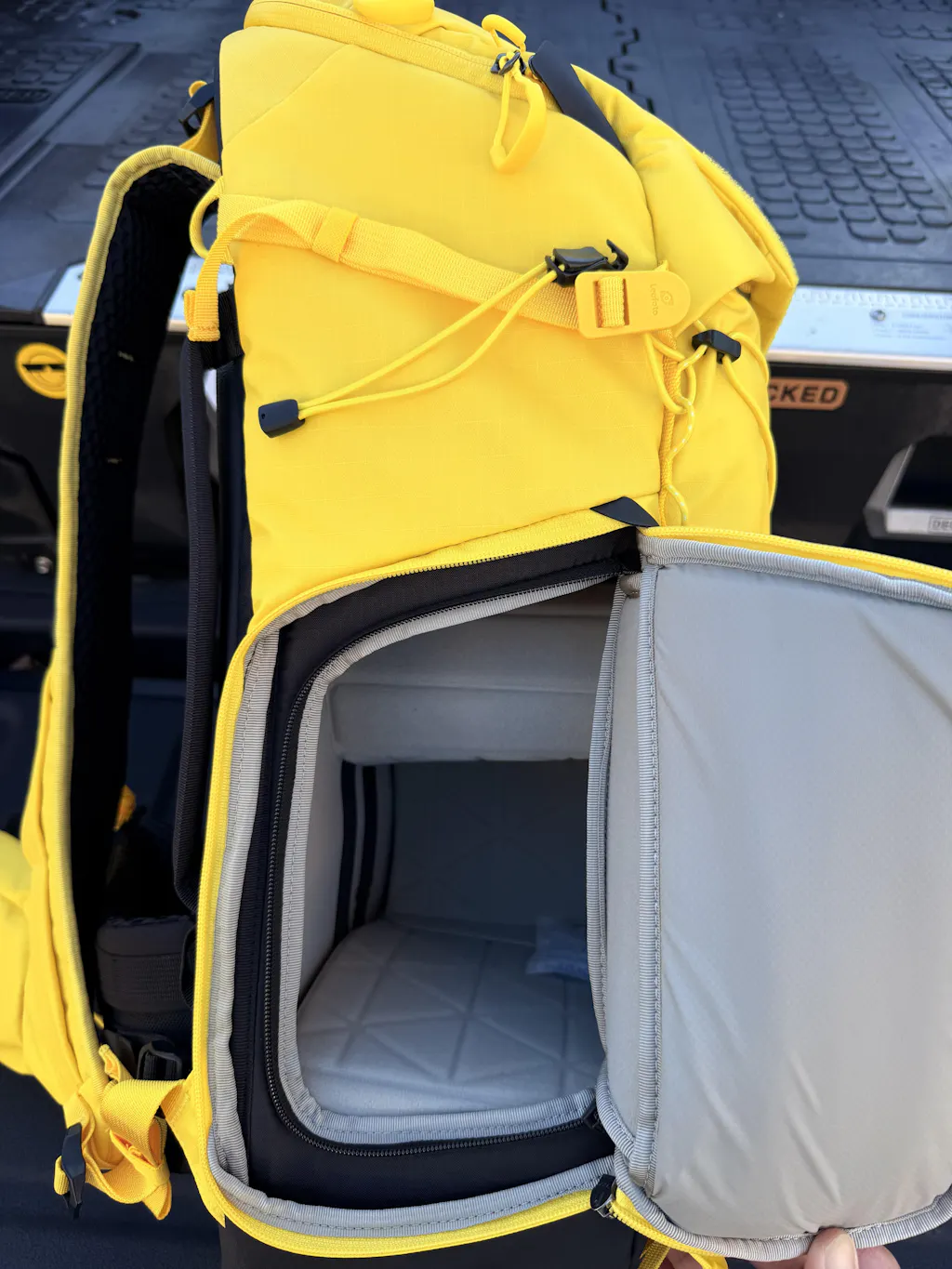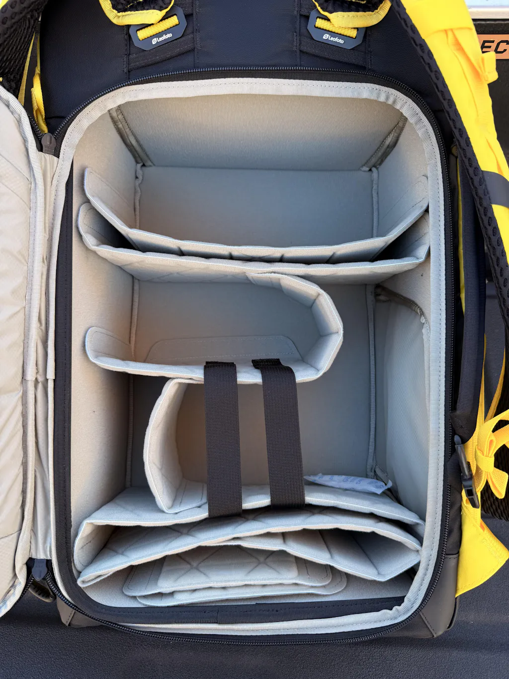 With a 35L capacity, the backpack accommodates cameras, lenses, drones, a 15.6” laptop, iPad, tripod, trekking poles, and more. The spacious camera compartment can fit large professional telephoto lenses such as the Nikon Z 400mm f/2.8 TC VR S. Dual compartments separate personal items from camera gear, with quick-access side and top openings for convenience.