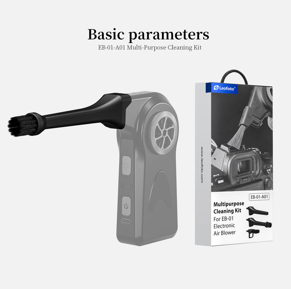 The Leofoto EB-01-A01 Multi-Purpose Cleaning Kit includes three attachments designed for use with the Leofoto EB-01 Electric Air Blower Jet Fan Cleaner. This kit helps you keep your photography and video equipment clean and free of dust.