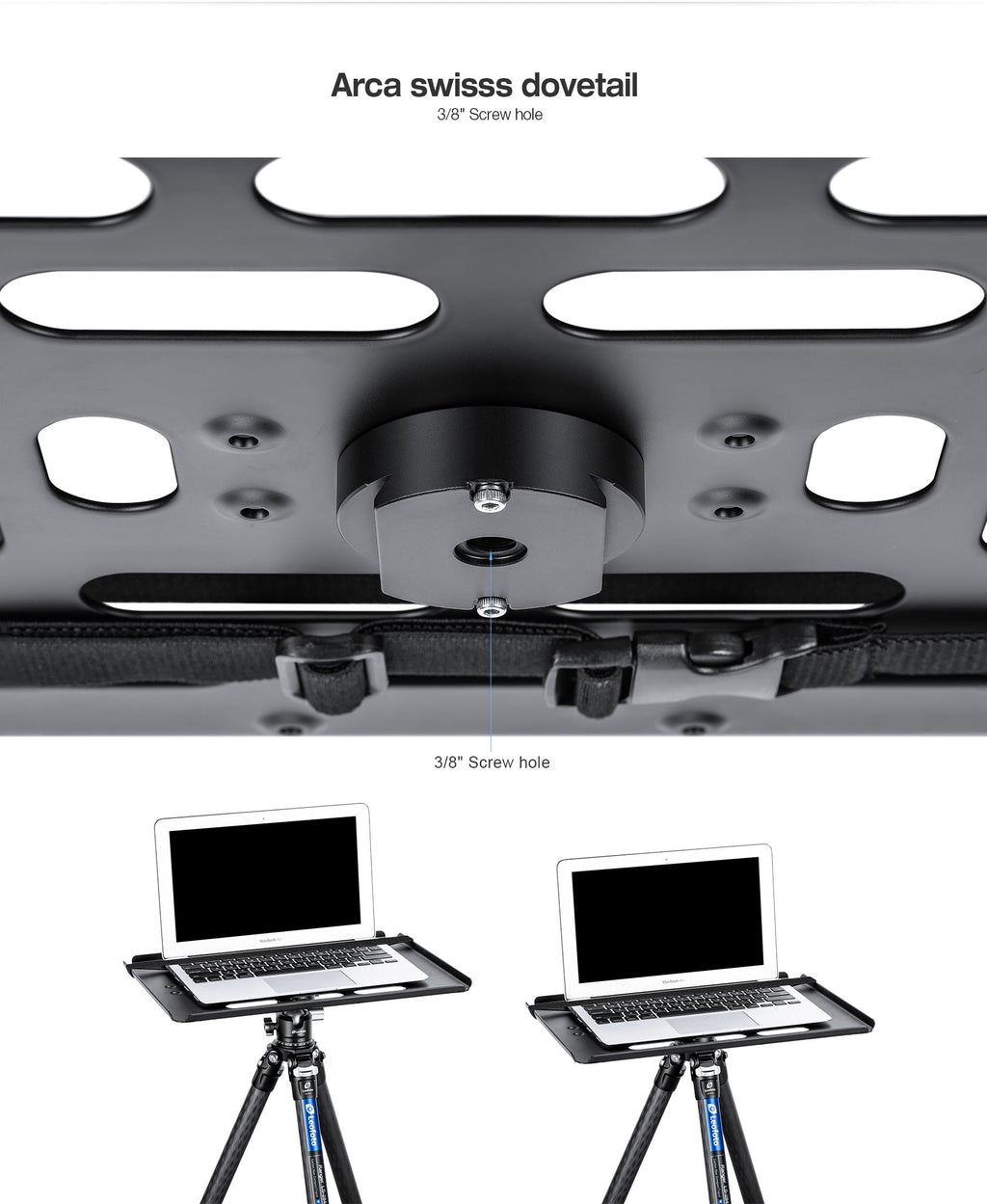 Leofoto LCH-2S is a lighter version of the LCH-2 tray designed for those who use laptops for post-processing. It has a 3/8'' mounting hole instead of the 1/4'' and 3/8'' options available on the LCH-2, making it even more lightweight. The tray is 8.9 inches and can accommodate almost all laptop sizes, with flanges on the four sides to prevent accidental dropping. It can be easily mounted on ball heads/tripods using the 3/8'' mounting socket and Arca standard dovetail.