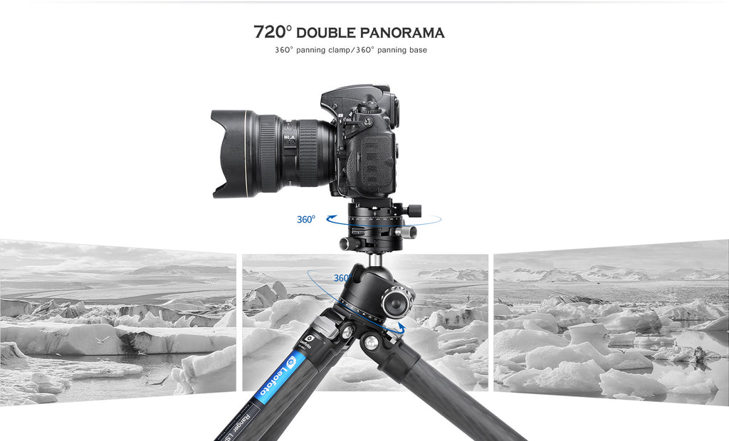 Mounted permanently on top of the ball head is a dual-axis geared panorama system, offering ±10° micrometric adjustment on both X and Y axes. Dedicated geared knobs allow precise, repeatable framing without drift, while 360° panning on both the top and base ensures accurate panoramic stitching. Laser-engraved scales provide clear reference points for interval control and consistent repositioning.