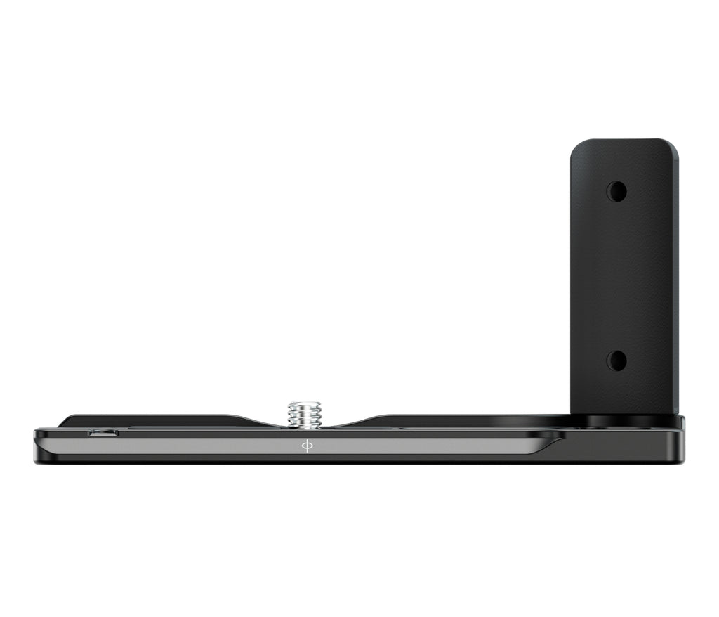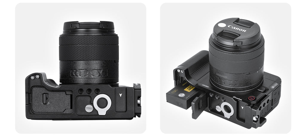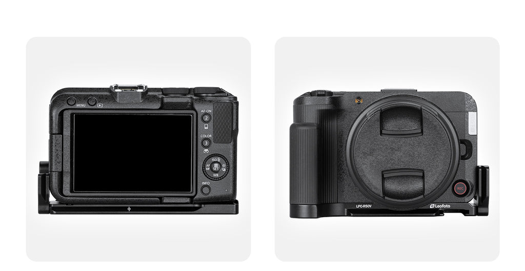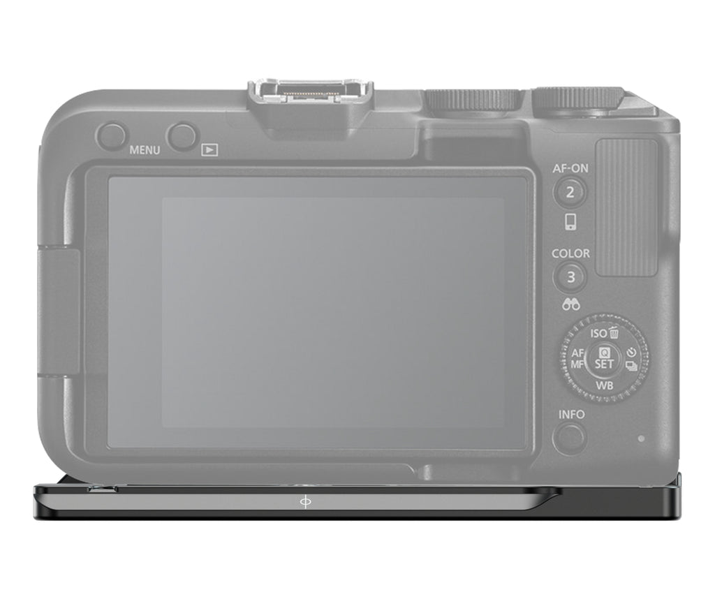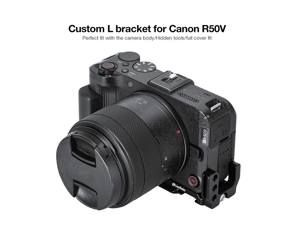 TheLeofoto LPC-R50V L Plate for Canon R50V Camerafeatures an Arca-type dovetail on each axis of the "L" design, allowing the camera to be mounted in either landscape or portrait orientation. The one-piece solid aluminum construction is durable yet lightweight, and it has a large opening on the vertical side for cable management.