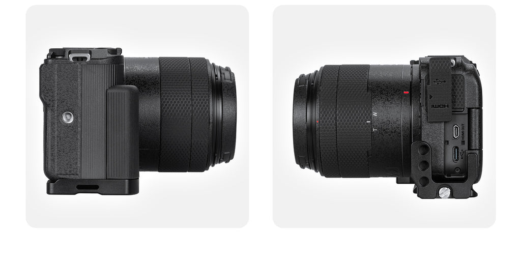Machined from 6061-T6 industrial-grade aluminum with an Arca-type dovetail groove in both the horizontal and vertical components. The open design provides access to all camera controls, ports, and the battery drawer.