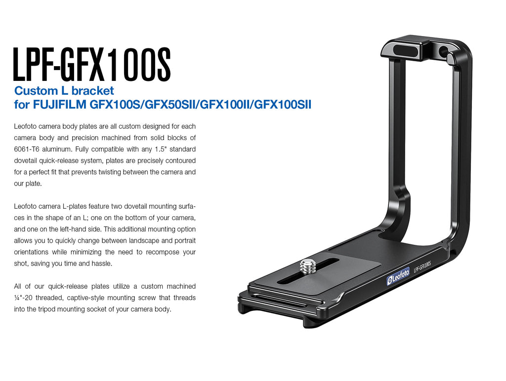 The Leofoto LPF-GFX100S L-Bracket is a precision-engineered mounting solution designed for FUJIFILM GFX100S, GFX50SII, GFX100II, and GFX100SII cameras. Crafted from solid aircraft-grade 6061-T6 aluminum, this L-bracket provides a secure, stable connection to your tripod, while maintaining full access to all ports, battery, and memory card slots.