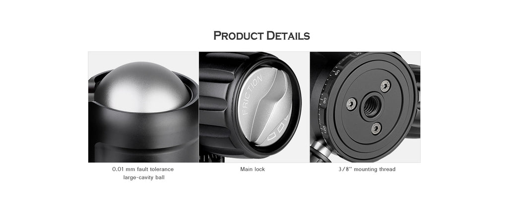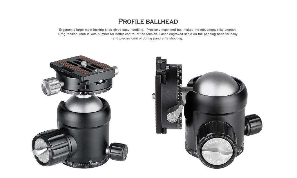 The Leofoto NB-40 Pro Panning Ball Head is a lightweight aluminum ball head with a large locking knob to control the movement of the ball, and a separate control for independent 360° panning base. Within the large locking knob is a tension control dial to adjust the amount of friction on the ball. Taking panoramic photos is simple thanks to the engraved panoramic scale and the independent 360° panning clamp on top.