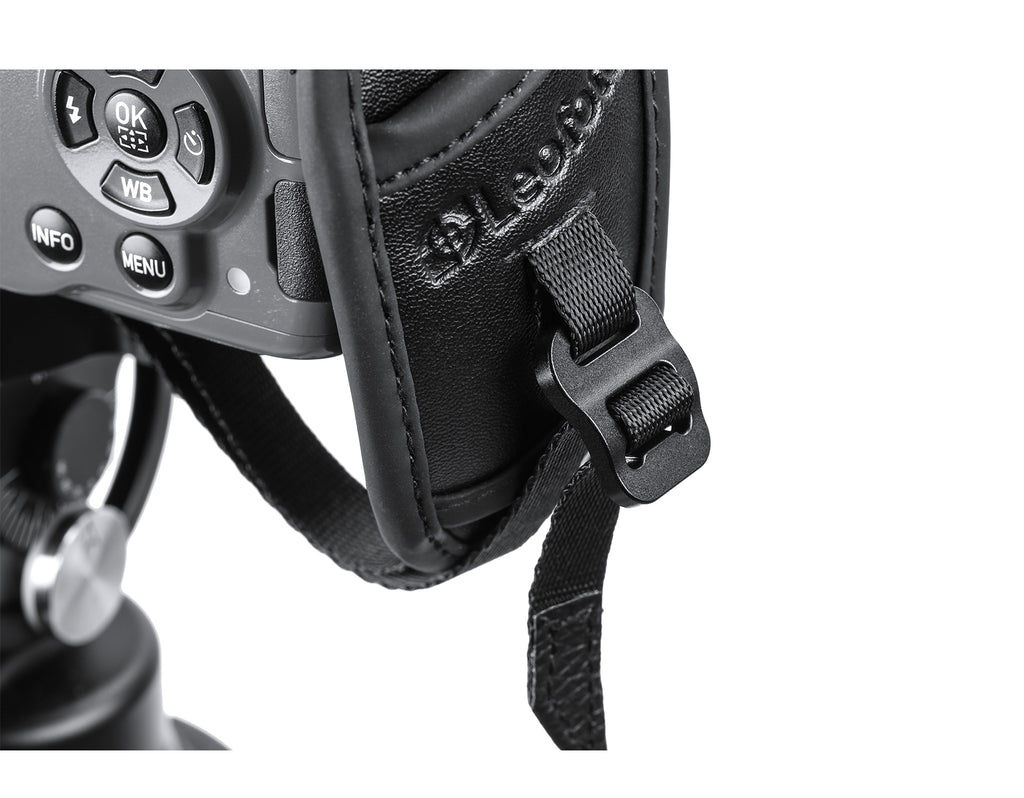 This camera hand strap attaches to your camera at two points: the camera strap mount and a cage or L plate with a strap slot.